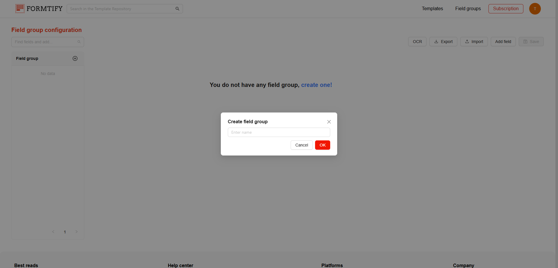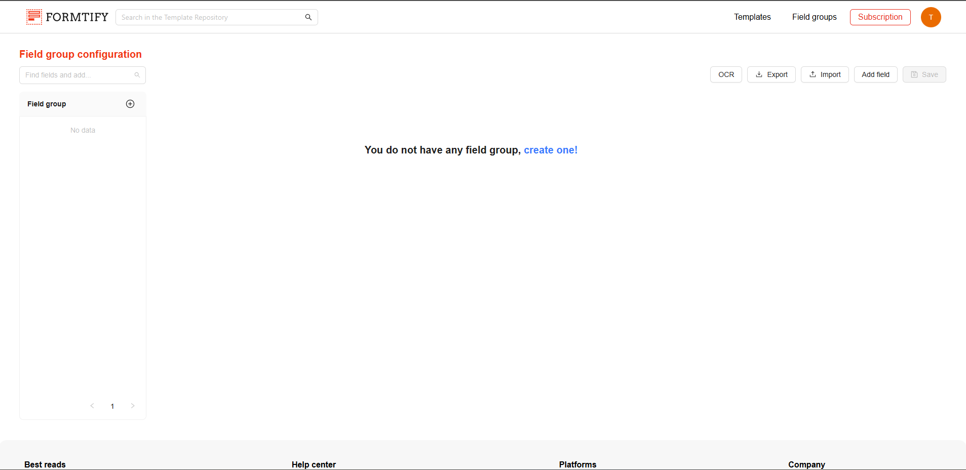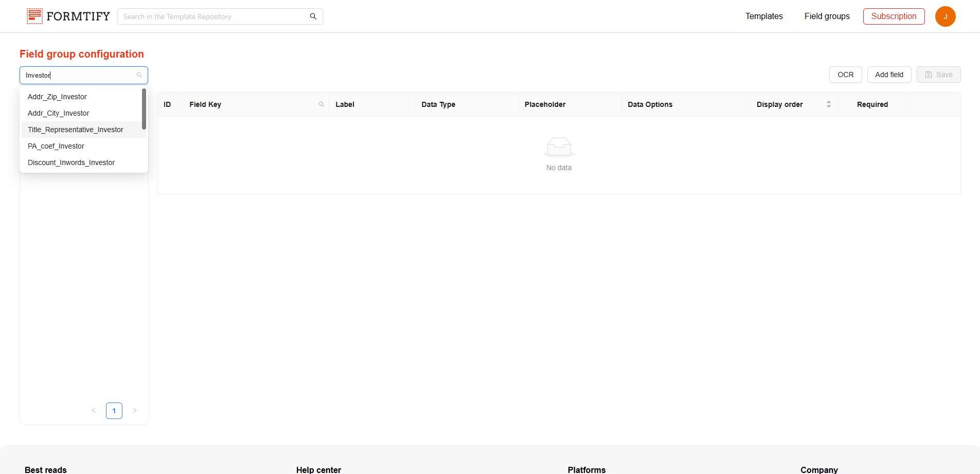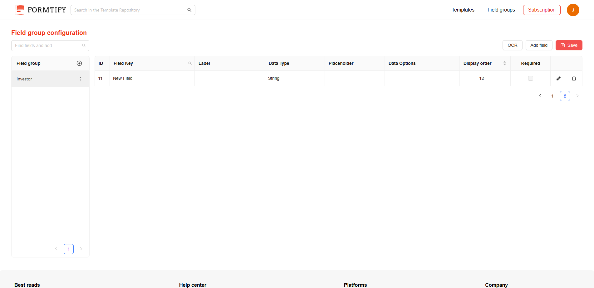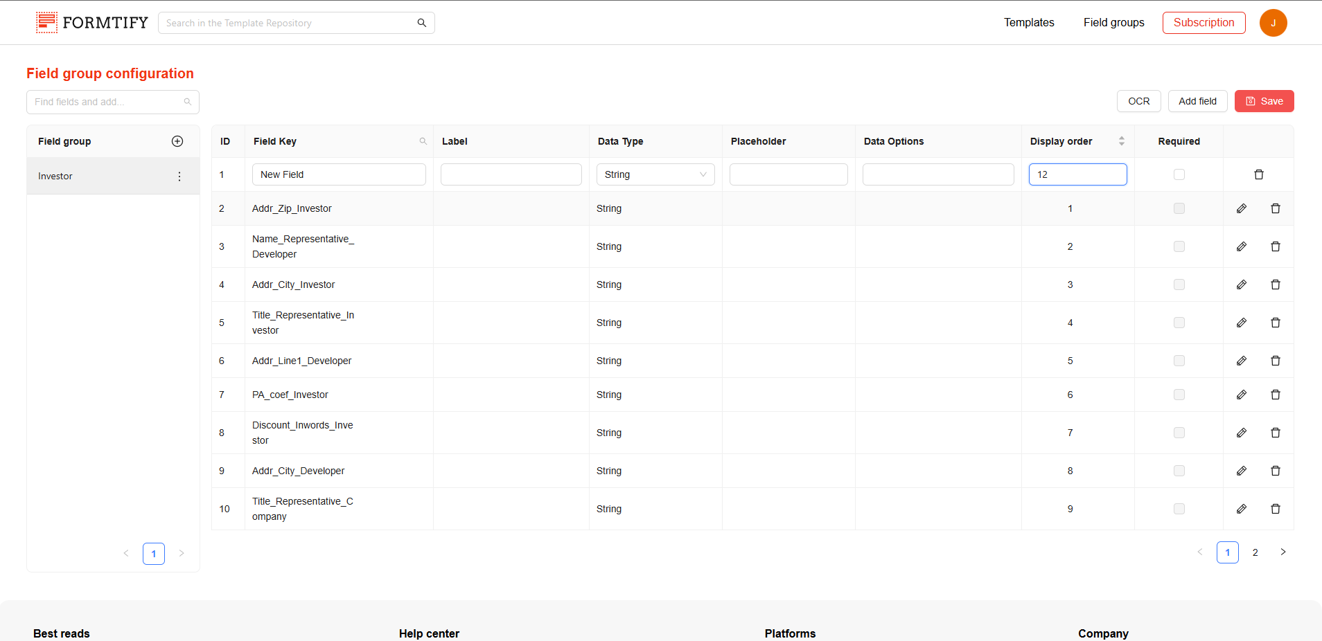 The Field Group Configuration Page allows you to create and manage field groups. On this page, you can create new field groups, add or edit fields, and organize them to streamline the document automation process.