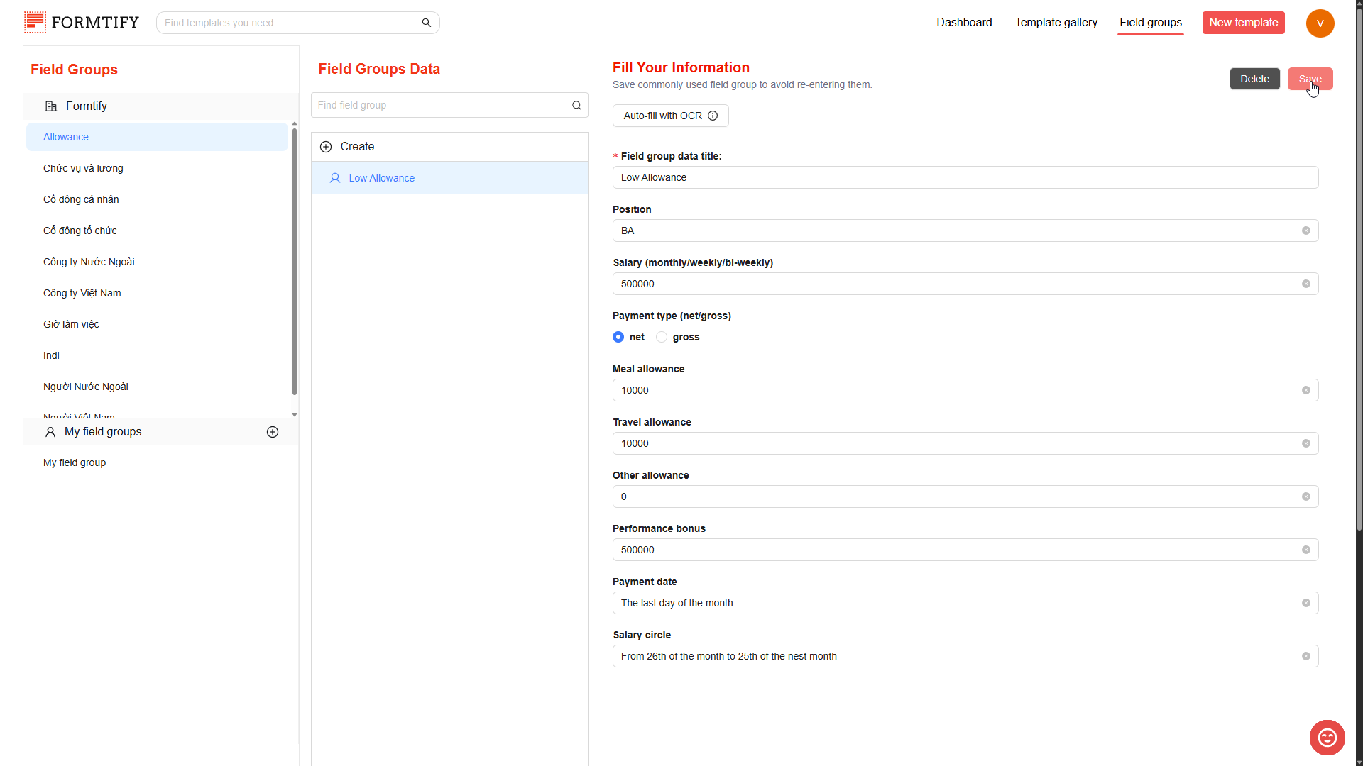 To edit or delete existing Field Group Data, click on the specific data entry in the Field Group page.