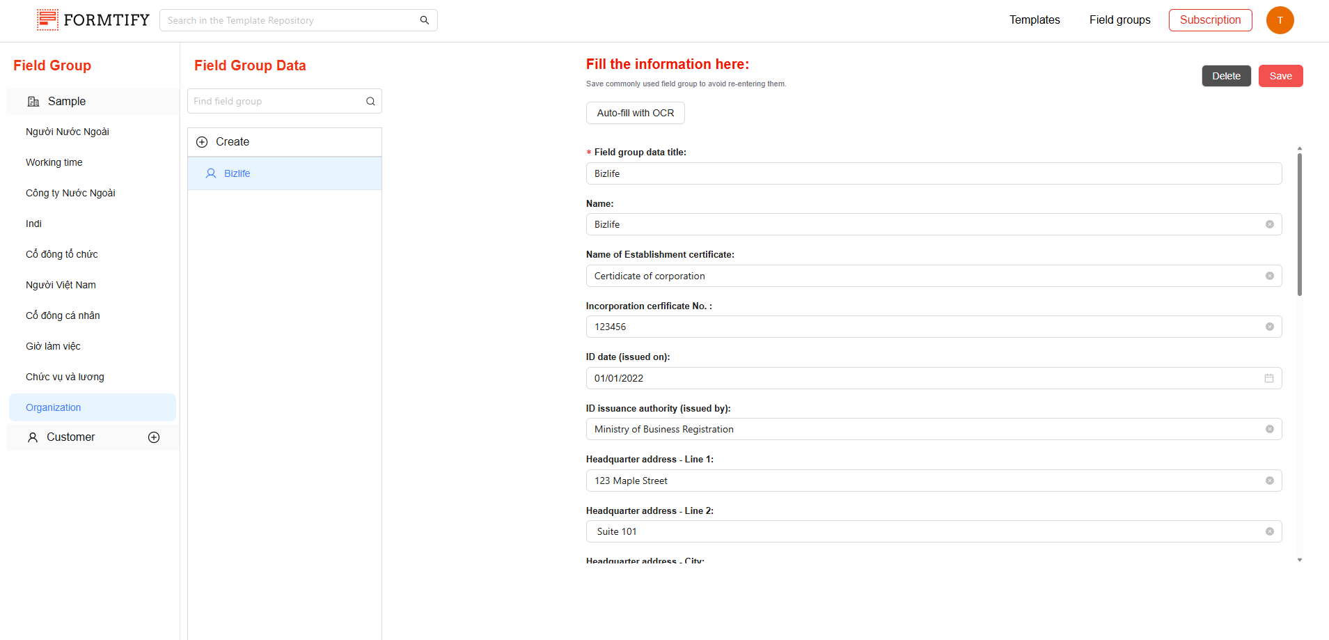 3. Faster Document Creation: Instead of manually filling fields for every template, you can use pre-filled Field Group Data for quick population.